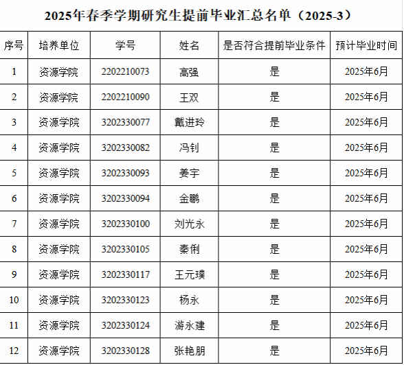 根据公司的相关通知要求,经研究生个人申请,公司初审,2023级硕士研究生(不含硕博连读、提前攻博研究生)、2022级博士研究生(不含直博生)、2020级直博生申请提前毕业名单如下,如有异议,请公示期内书面反馈意见至研究生科(联系人:周老师,办公室:主楼336,电话:67883627),公示期即日起至2025年3月2日。