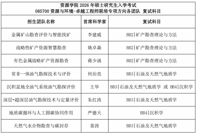 2026年硕士研究生入学考试085700资源与环境专业卓越工程师联培专项方向各团队复试科目