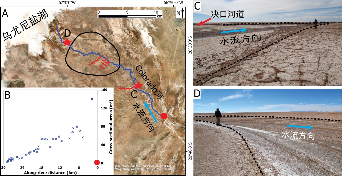 近日,国际知名期刊Journal of Hydrology在线刊发了李嘉光副教授团队在陆相湖盆边缘河流末端沉积体系研究的最新成果"Digital elevation models for topographic characterisation and flood flow modelling along low-gradient, terminal dryland rivers: A comparison of spaceborne datasets for the Río Colorado, Bolivia"。文章选取世界上最大的南美乌尤尼盐湖边缘Colorado河末端区为研究对象(图1),成功地构建了研究区的水文模型,模拟了洪水过程,表明漫溢过程中的洪水空间分布特征。该项研究首次精确表征极低缓河流末端地形特征,模拟河道沿程变化下洪水漫溢过程,为广泛运用于旱区河流体系水文过程-沉积响应的研究提供支撑。