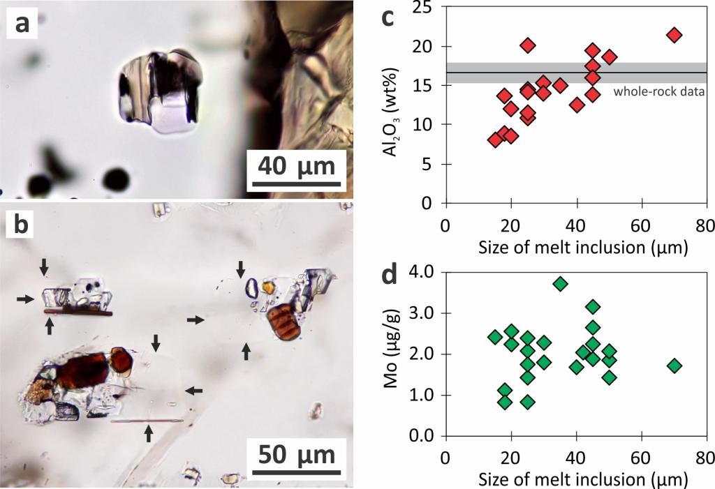 图2 基性侵入体中结晶质熔体包裹体的特征和化学成分。(a)和(b)分别为橄榄石和斜长石中的结晶质熔体包裹体,包裹体由相比例一致的粗粒矿物集合体±气泡组成;(c)和(d)为涞源橄榄石中结晶质熔体包裹体Al2O3和Mo含量与包裹体大小的关系;较小的熔体包裹体中显著偏低的Al2O3含量是由于包裹体捕获后发生铝的扩散迁出造成,不同大小的熔体包裹体中非常一致的Mo含量表明原始熔体中可能含1‒3 µg/g Mo。
