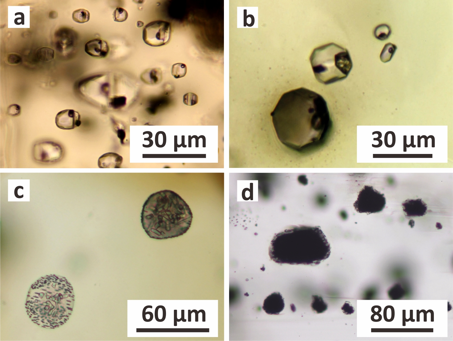 图1 中基性火山岩和斑岩脉中结晶质熔体包裹体的特征。(a)‒(d)寄主矿物依次为斜方辉石、单斜辉石、橄榄石和斜长石。