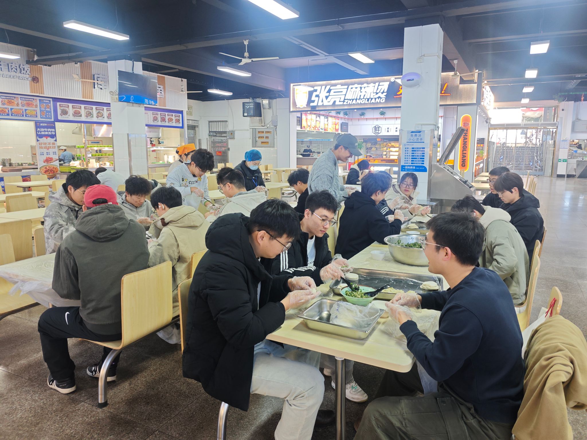活动现场暖意融融、氛围热烈。400 余张饺子皮分发至四个小组,经验丰富的同学带头示范,新手们积极响应,纷纷亮出包饺子技艺。元宝形、月牙形、麦穗形等形态各异的饺子在大家的巧手下接连诞生。包制过程中,大家围绕南北方冬至习俗、民俗文化内涵展开深入交流,分享“冬至不吃饺子,冻掉耳朵没人管”的趣味俗语,探讨“漏馅不叫漏,叫挣”的吉祥寓意,在欢声笑语中增进了相互了解,党团组织的凝聚力在动手实践中悄然升温。