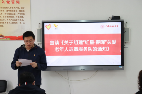 李前宣读《关于组建“红星·春晖”关爱老年人志愿服务队的通知》。