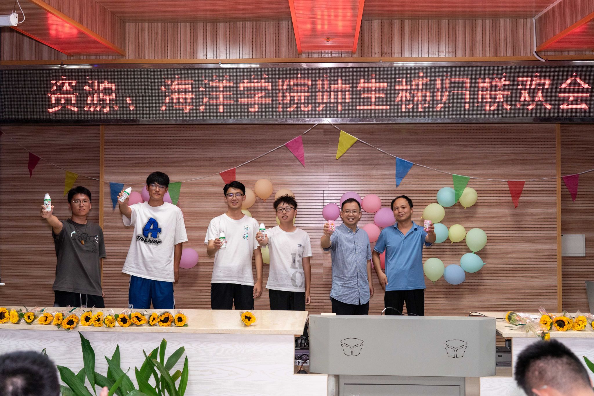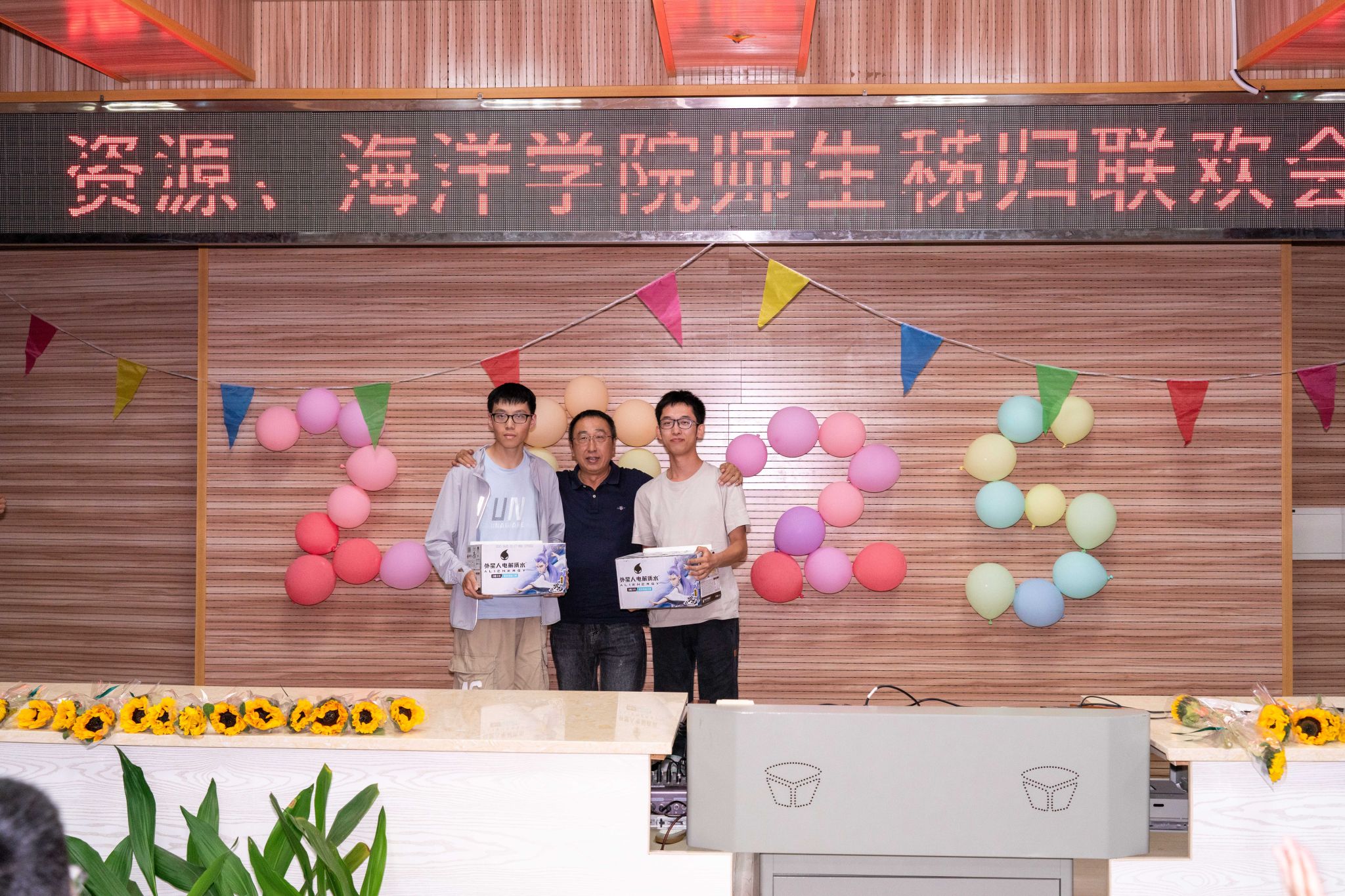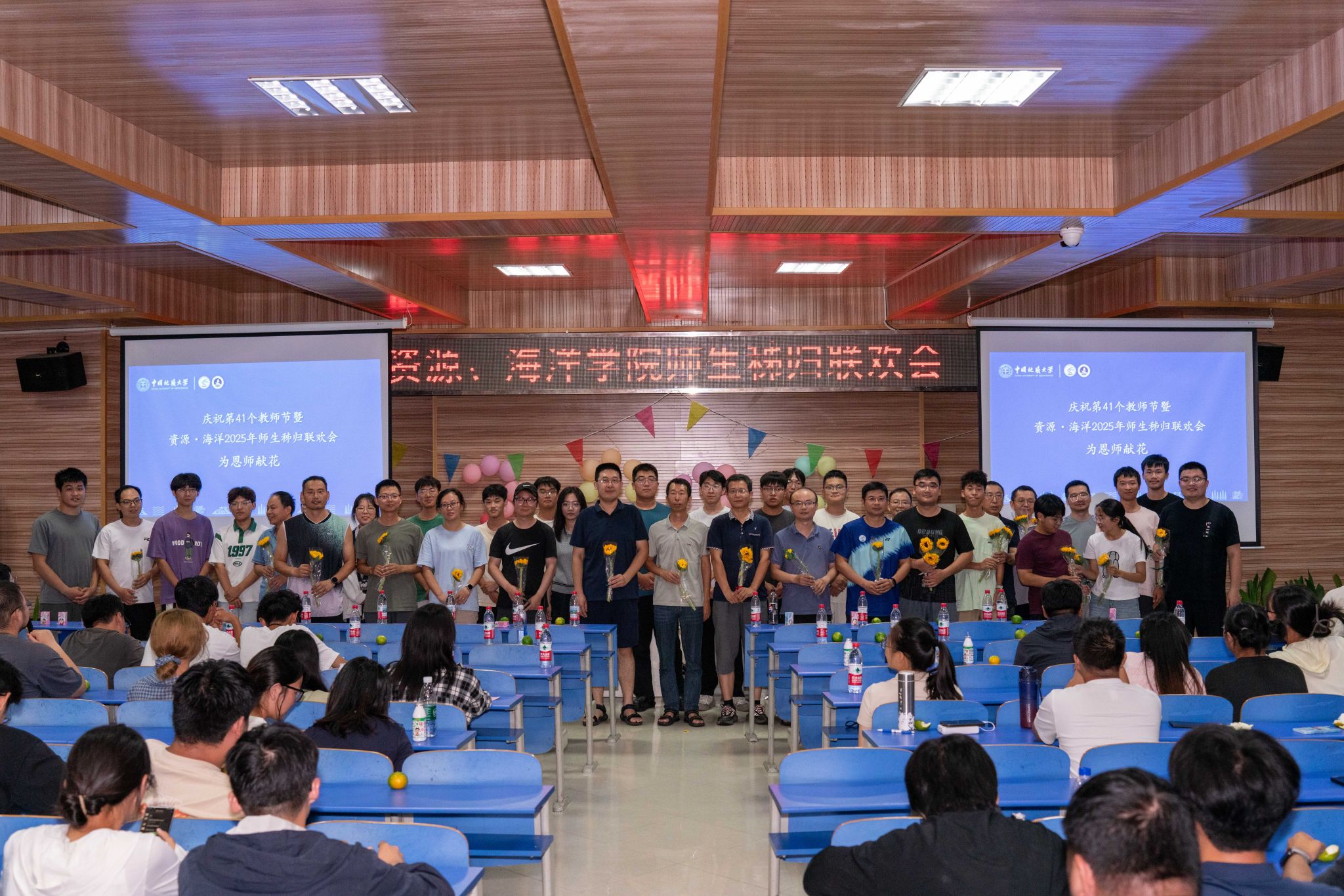 晚会的温情持续延展,主持人朗读员工手写的教师节祝福卡片:“于秭归实习,探寻地质奥秘,方知师恩如山……”字字真挚,句句动人。员工代表向两院教师献上向日葵花束,一声“教师节快乐”,凝聚了多少难以言表的感恩。