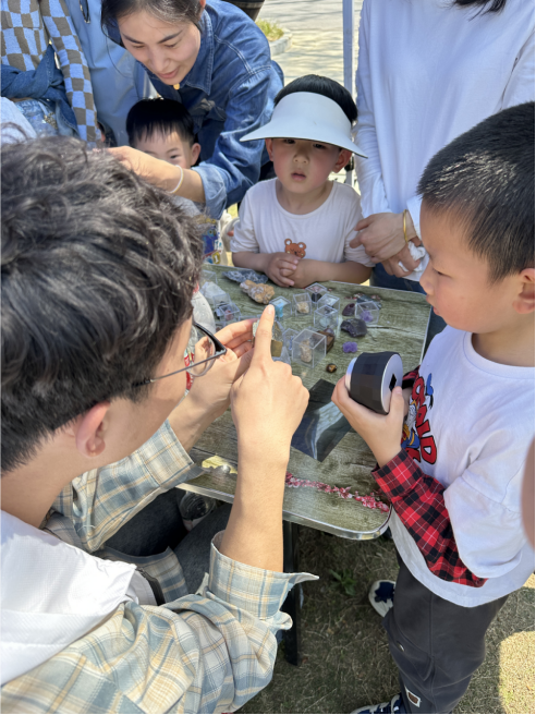 “信口雌黄”的由来、蛋白石的形成、石青作为颜料在《千里江山图》中起到的作用……在志愿者们生动活泼的科普下,吸引了一大批小朋友,他们围在桌前,津津有味地听着志愿者们讲述每一份矿标背后的故事。