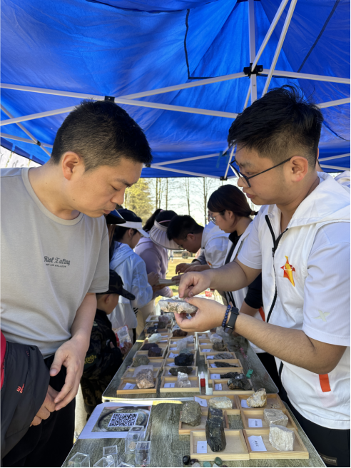 活动过程中,骄阳闪耀,志愿者们积极热情,为来往市民展示精美矿标、普及地学知识。在志愿者们风趣通俗的讲解下,摊位很快被市民群众团团围住。