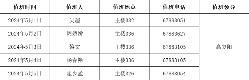 4.认真做好突发事件的处置和信息报送工作。公司严格落实公司值班值守制度,做好假期值班(值班表见附表1),确保信息渠道畅通。员工如遇重大突发事件要第一时间上报值班老师,坚决杜绝迟报、瞒报,并在值班老师的指导下采取有效措施及时妥善处置。