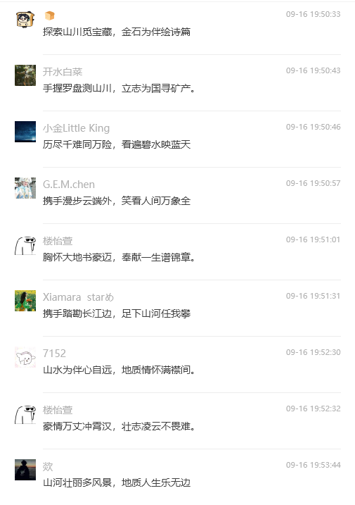 据悉,在最近的秭归地质实习期间,太阳成集团tyc234cc主页的师生们以实习路线上的自然风貌和专业实践为灵感,创作了超过120首地质主题的诗歌。特别是中秋节前夕,在刘晓峰老师的诗意引领下,一句七言绝句激发了同学们的创作热情,他们迅速将实习中的所见、所学、所感,凝练成一首首充满激情的诗篇,在班级群里接力分享,有的作品甚至在短短几十秒内一气呵成。这些诗歌抒发同学们立志将个人理想融入国家发展大局的报国之情,以及将专业知识转化为服务社会的实际行动的信心。这也是秭归实践教学团队多年来一直打造实践教学文化品牌,将传统文化和地学文化融入野外实践课程,激励和培养同学们艰苦奋斗、实事求是、敢于探索的科学精神,同时让员工欣赏祖国大好河山,感受实习区人文底蕴。
