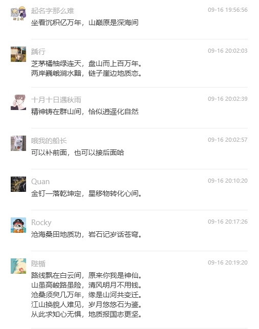 一石激起千层浪,百余首地质诗歌在秭归地质实习基地即兴创作。9月15日的茅垭公路云雾缭绕,2022级员工在秭归茅垭村开展地质实习。秭归实践教学团队学术指导刘晓峰老师随队在茅垭村路线中触景有感,即兴吟诵两句七言诗:路线飘在白云间,原来你我是神仙。这两句简短却意境深远的诗句一经转发至实习班级群,便立即引发了同学们的热烈反响和积极参与。在接下来的50分钟里,班上30位同学纷纷作诗对句,将自己对地质实习的感受和对自然之美的感悟融入其中。“手握罗盘测山川,立志为国寻矿产”“携手踏勘长江边,足下山河任我攀”“山水为伴心自远,地质情怀满襟间” “地壳变迁岁月长,岩层叠嶂见沧桑” “芝茅橘柚绿连天,盘山而上百万年” “金钉一落乾坤定,星移物转化心间”等等。同学们以诗传情,以地质为语,不仅展现了地质科学的严谨与浪漫,表达了员工们对地质学科的热爱,更传递了地质人勇于探索、不懈追求的精神风貌,增强了大家作为新时代地质人的身份认同感和使命感。