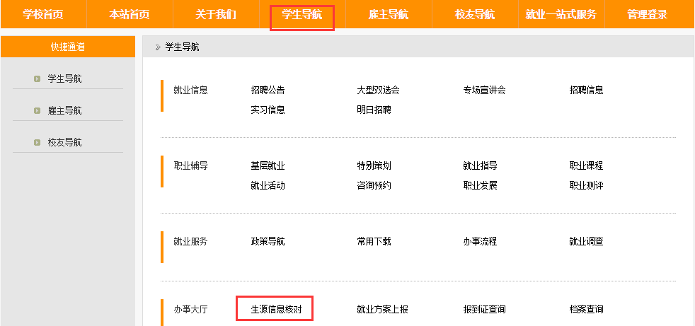 在就业网首页点击“员工导航”,选择“生源信息核对”。