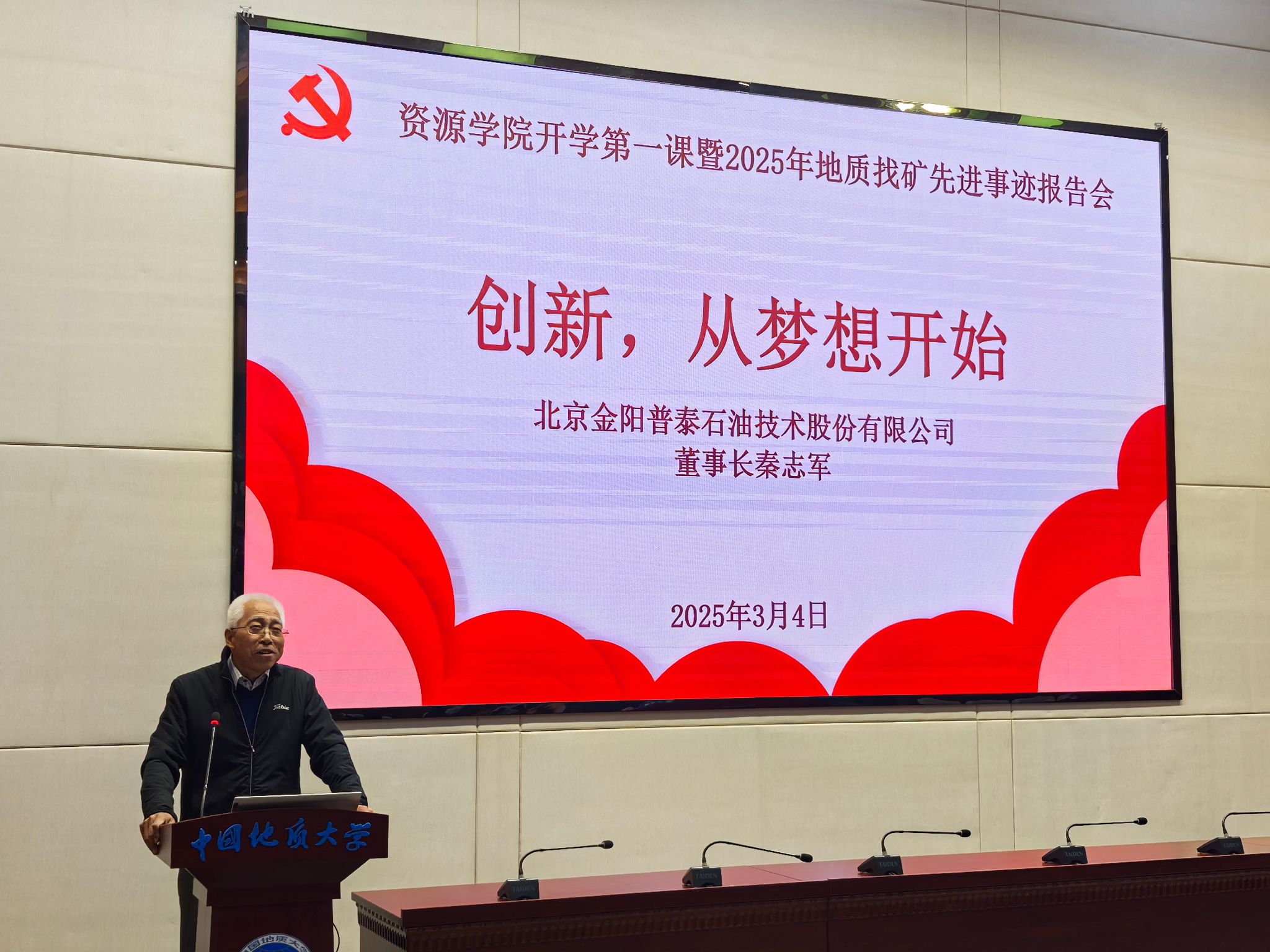 3月4日,公司举行“开学第一课暨地质找矿先进事迹报告会”。北京金阳普泰石油技术股份有限公司董事长秦志军、总经理袁钢辉,公司武汉代表胡甫强、王亚婧,公司党委员工工作部部长朱丹,资源公司党委书记汪再奇,党委副书记谭文伦,副经理李占轲,教师代表谢丛姣参加,举行了金阳普泰创新奖学金颁发仪式、校外兼职辅导员聘任仪式。秦志军在开学第一课中讲到,创新的源头在于梦想,而梦想的实现离不开切实的行动、扎实的学习和长久的坚持。他鼓励同学们要燃起梦想的火苗,敢想敢干、巧干实干,不畏艰难、不怕失败,在不断的实践中勇于创新,敢于追逐更加辉煌的梦想!
