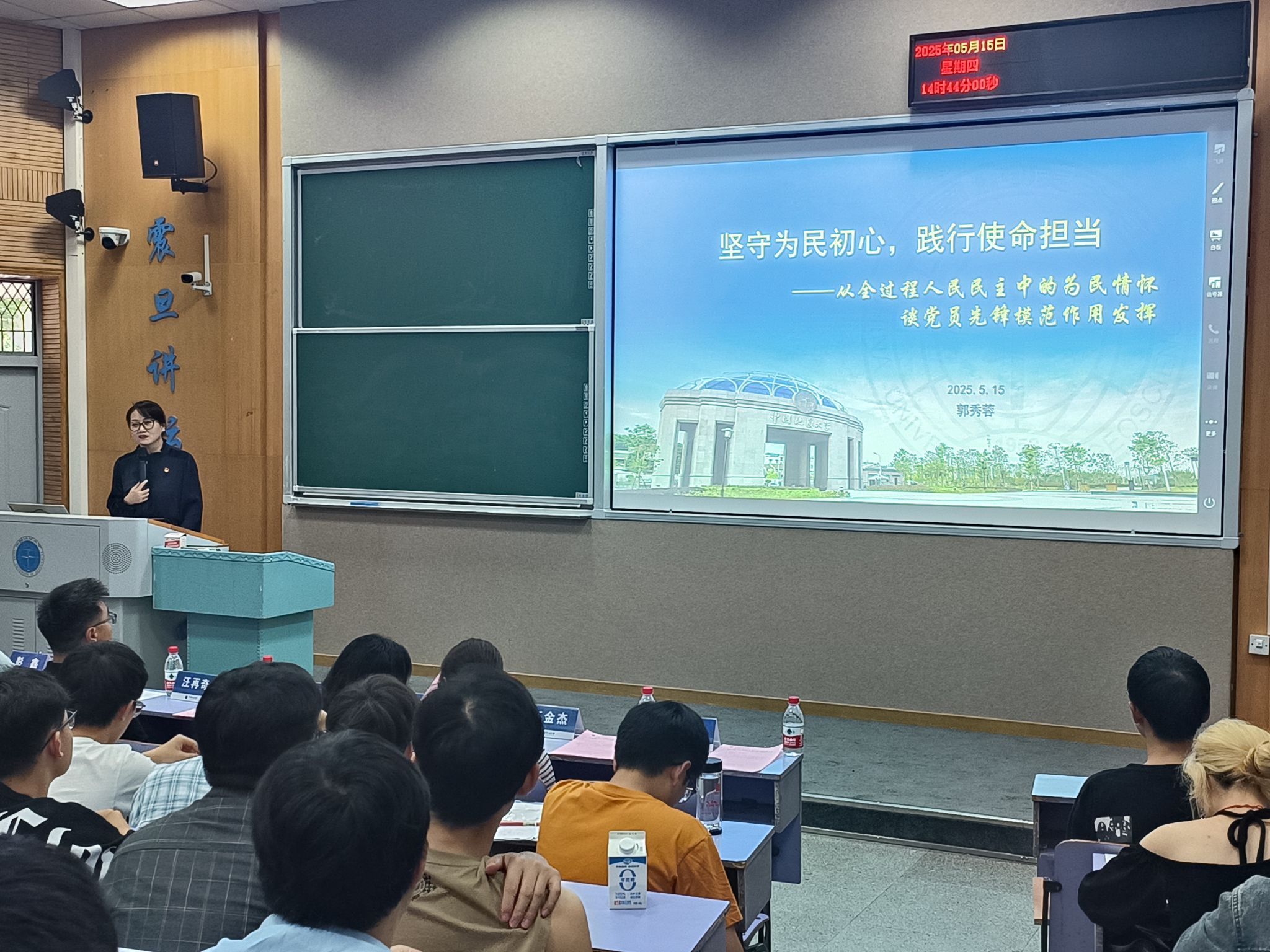 集团工会常务副主席、公司兼职组织员郭秀蓉以“坚守为民初心 践行使命担当—从全过程人民民主中的为民情怀谈党员先锋模范作用发挥”为题作专题汇报。她详细介绍了全过程人民民主的内涵,强调其以人民为中心的价值导向,并从为民情怀的视角探讨党员如何在实践中践行初心使命。她要求全体党员要充分发挥先锋模范作用,以实际行动做身边同学的排头兵、顶梁柱和连心桥。