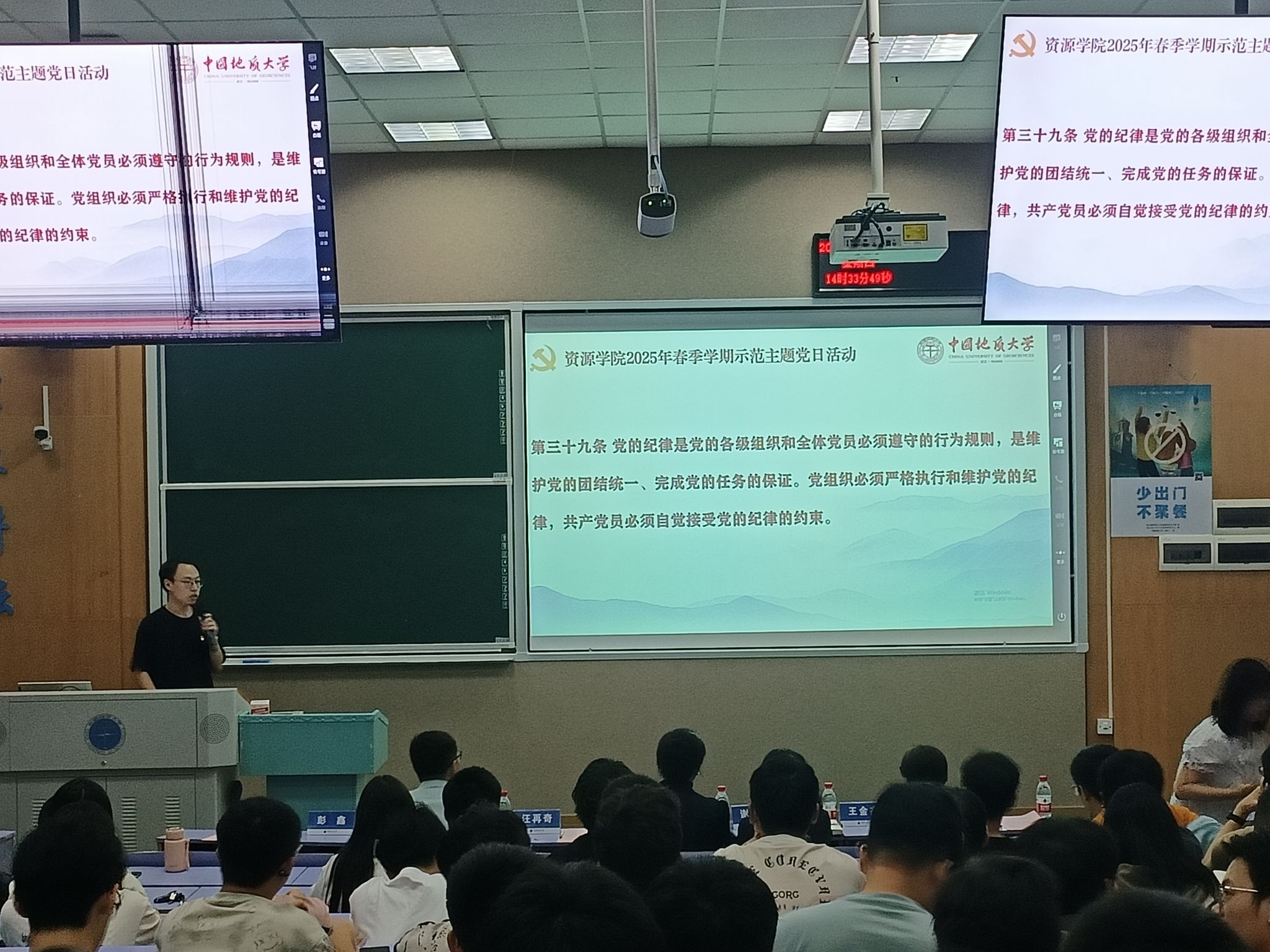 矿床学研究生党支部书记王显康领学党章第七章党的纪律第三十九至四十条内容。