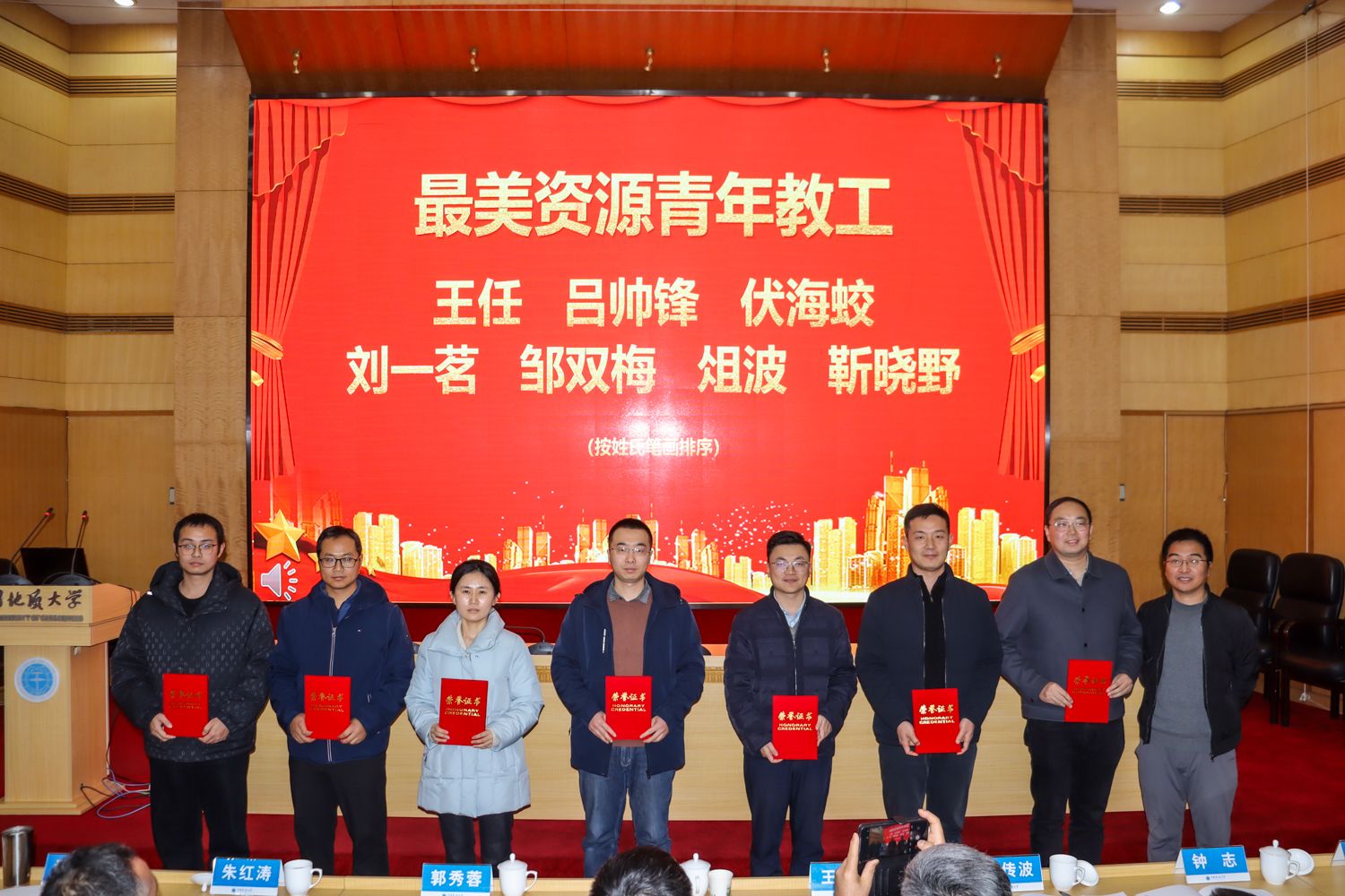 平宏伟为2025年度“最美资源青年教工”获得者王任、吕帅锋、伏海蛟、刘一茗、邹双梅、俎波、靳晓野颁奖。