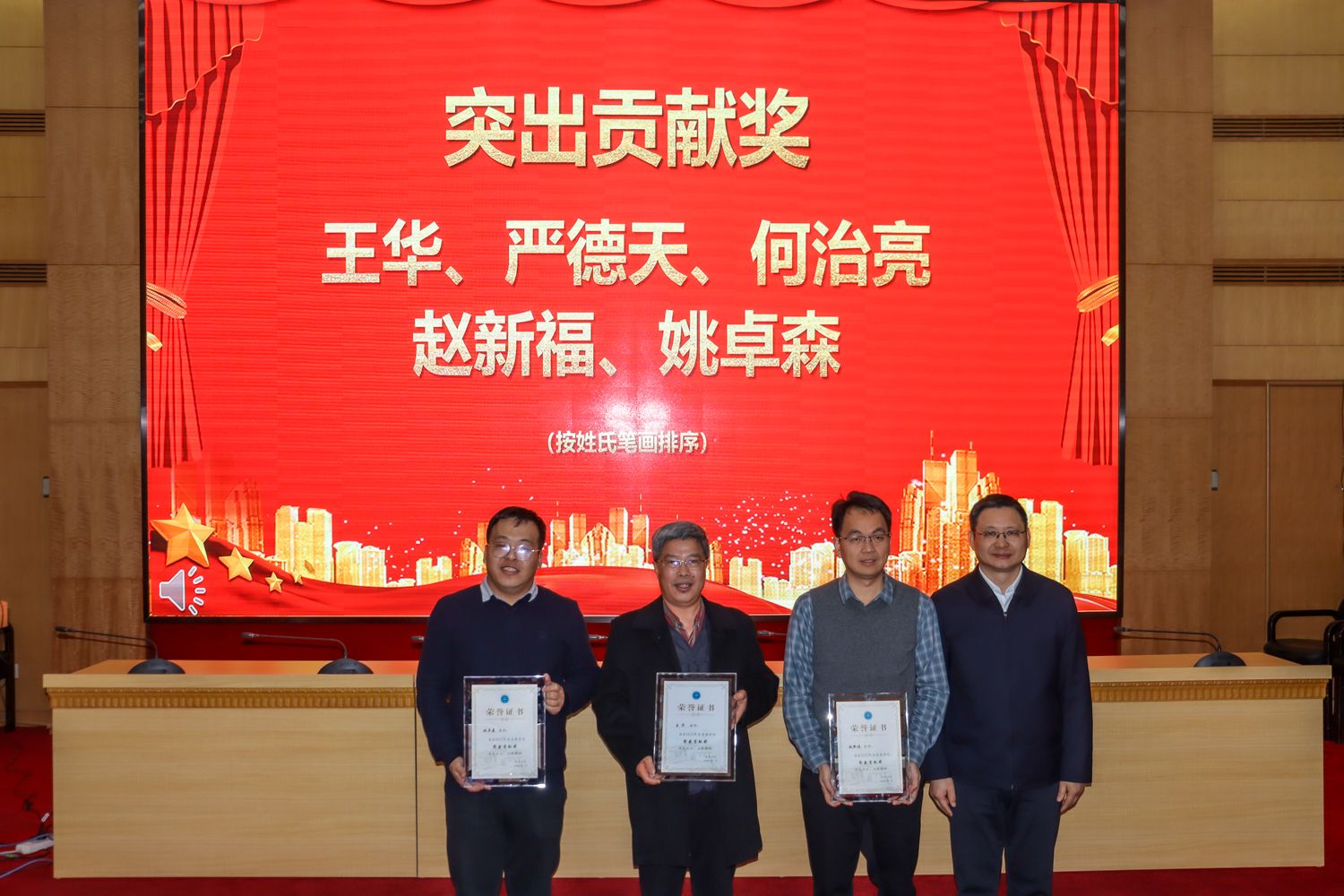 刘杰为公司“突出贡献奖”获得者姚卓森、王华、赵新福颁奖。
