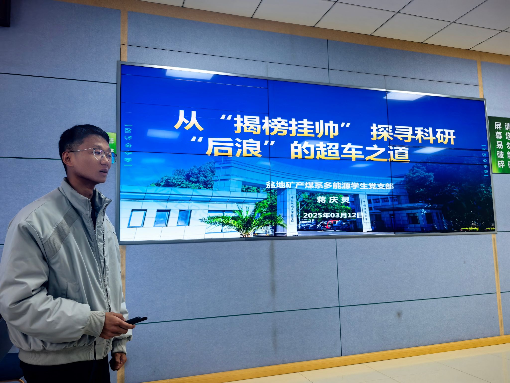 煤系多能源员工党支部党员、“挑战杯”揭榜挂帅专项赛全国一等奖团队主要成员蒋庆灵分享了参赛成长与体会。他从地质思维培育、科研方法探索、AI技术辅助找矿、团队协作攻关等方面,全面展示了项目从构思到成果落地的完整路径,展现了青年党员“脚踏实地、勇于创新”的精神风貌,激励在场同学敢于尝试、积极作为。