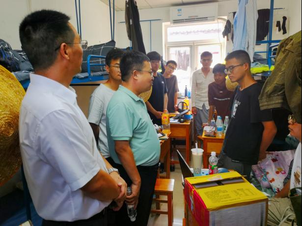 高复阳、严德天首先来到教工宿舍看望慰问实习教学团队教师,了解教学安排和实习进展。他们对教学团队在高温考验中完成备课任务、在暴雨影响下保障员工安全到站并及时调整和完成教学任务表示肯定和感谢,叮嘱教学团队要把安全放在首位,稳妥完成后续教学任务,持续丰富员工实习内容和在基地生活,给员工留下宝贵和难忘的青春记忆,打下坚实的野外地质工作基础。