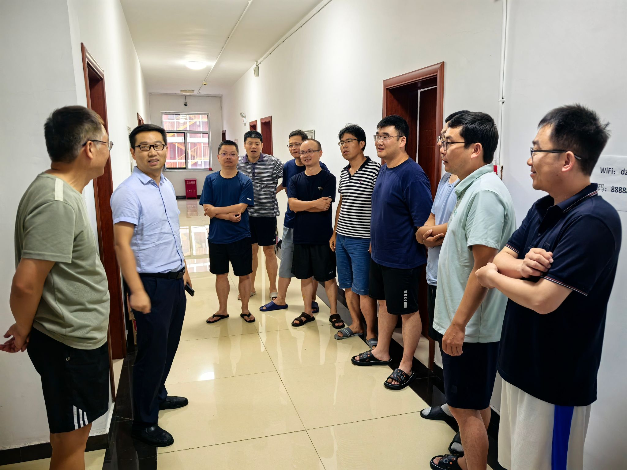 谭文伦一行先来到教师公寓看望慰问实习教学团队教师。他与老师们热情交谈,了解出野路线、教学情况和实习进展,代表公司向辛苦备课、认真教学的老师们表示肯定和感谢。在了解北戴河近期多变的天气后,他叮嘱教学团队要时刻紧绷实习安全这根弦,稳妥完成后续教学任务,让员工在安全有序、寓教于乐的实践学习中扎实野外地质工作基础。