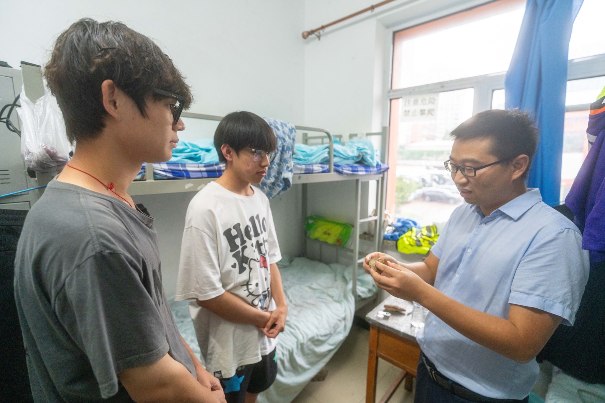 随后,谭文伦一行走访员工宿舍。他与同学们亲切交谈,查阅员工野簿和野外样品,了解在站学习和生活状况。