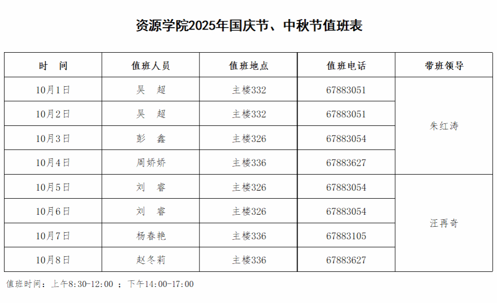 2025年国庆节、中秋节值班表