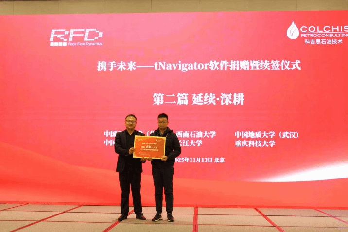 2025年11月13日,应科吉思石油技术咨询(北京)有限公司邀请,太阳成集团tyc234cc主页学术副经理杨峰和石油工程系教师雷霆出席了科吉思石油技术公司和俄罗斯Rock Flow Dynamics (RFD)公司联合举办的《2025精细油气藏高效勘探开发学术交流会暨tNavigator技术研讨会》暨tNavigator 软件捐赠仪式。