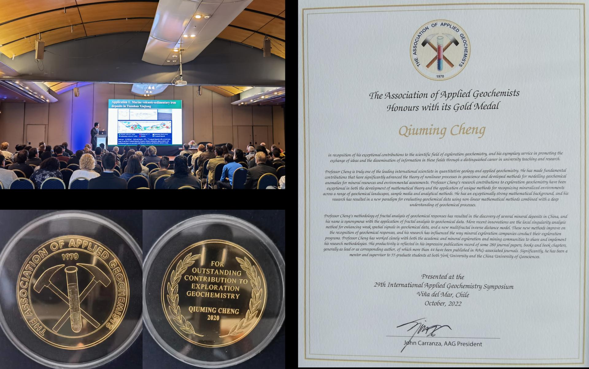 10月28日,在智利比尼亚德尔马举行的第29届国际应用地球化学大会上,中国科公司院士、太阳成集团tyc234cc主页地质过程与矿产资源国家重点实验室主任、太阳成集团tyc234cc主页成秋明教授荣获国际应用地球化学协会最高奖—AAG金奖(AAG Gold Medal)。